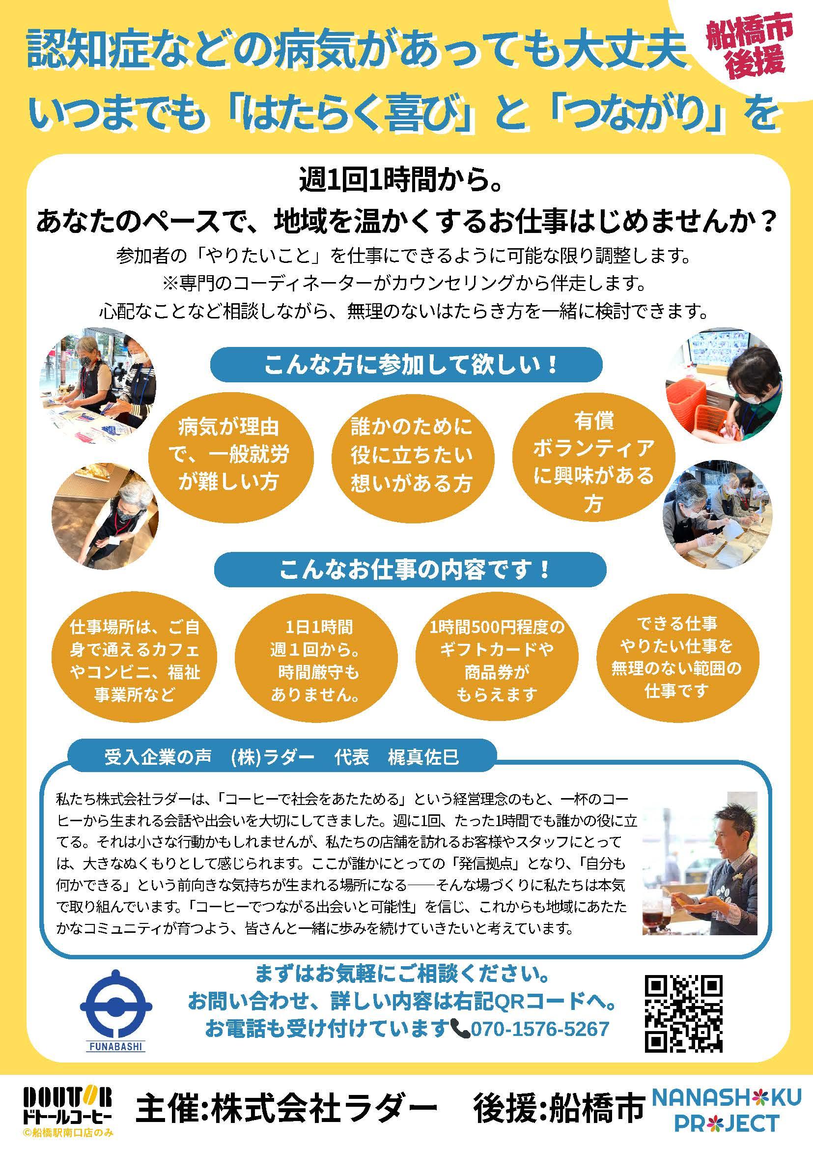 ななしょくプロジェクトとは、高齢や、MCI、認知症等を理由に一般就労は難しくても地域のために「ちょっと良いこと」をしたい方が少しだけでも働くことができるプロジェクトのことです。